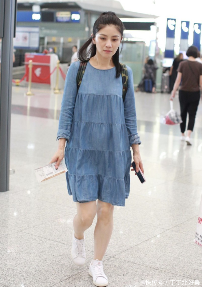 连衣裙和高跟鞋确实是很好的搭档,但并不意味着只有穿高跟鞋才能显瘦。偶尔我们也可以为了追求舒适换成小白鞋,胡可选择小白鞋配上牛仔连衣裙,整个造型的风格更为休闲,减龄的效果太棒了。