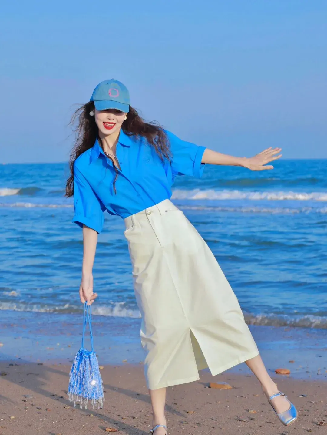 无论是选择衬衫、针织衫半身裙或者是其他天蓝色的单品,总能够快速的彰显温柔感,包容性极强,无论是什么场合,运用天蓝色的单品似乎总是不会出错的。