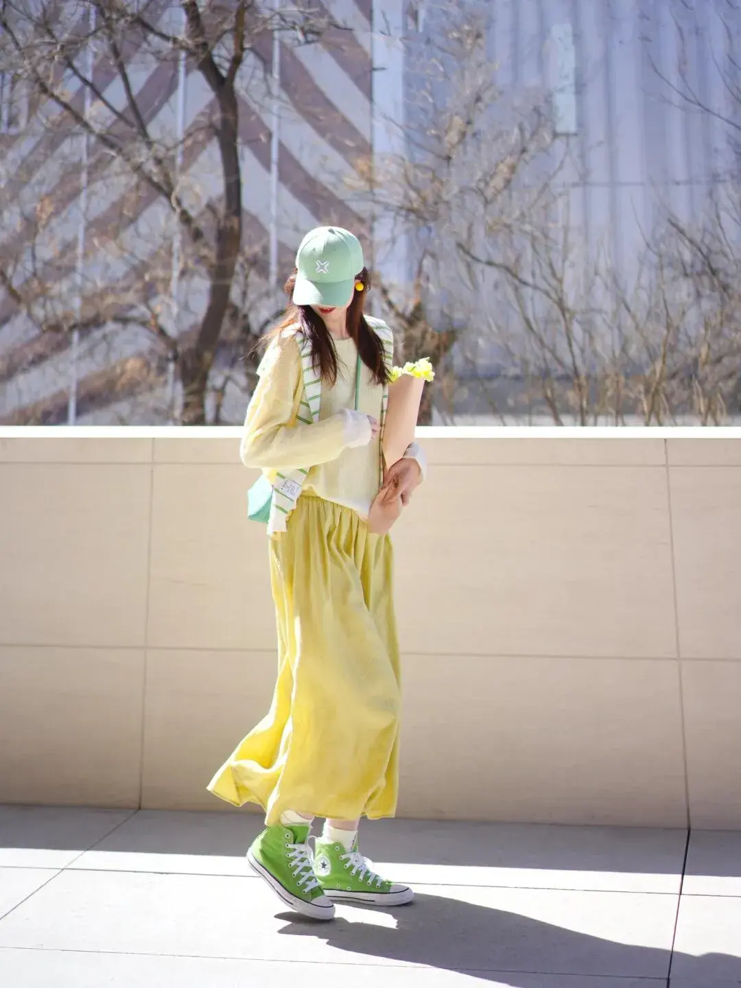 如果肤色比较暗沉,蜡黄的话,我们再选择一些明黄色的单品的时候,尽可能的小面积点缀,或放在下半身来进行穿搭,如果肤色白皙,并且是计划出游的话,就可以选择一些黄色系的单品大面积运用,拍照出片,氛围感更好,更加的青春靓丽,
