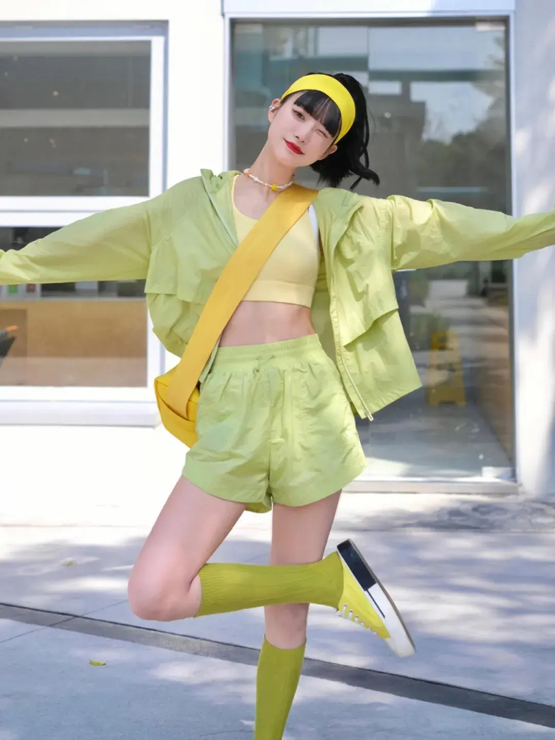 春季可以选择这一种轻薄的浅绿色套装,用一点简约的外套搭配上短裤,清爽又干净,既能保持一定的露肤度,整体气质上也更加的浪漫唯美,运动感满满。这位博主搭配上了嫩黄色的运动背心和黄色发带,以及黄色的斜挎包,色彩真的很有春天草木发芽的感觉,活力减龄,显白又自信。