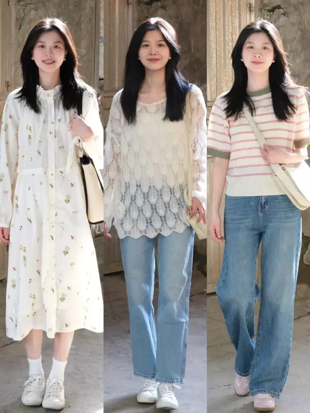 如果服饰的颜色避免掉太多的白,那么我们就可以选择一些白色的鞋子和白色包包来进行搭配,既有呼应的地方,也足够的清爽干净。