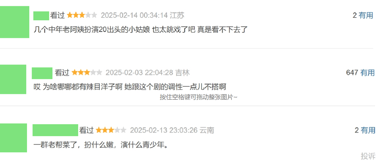 什么样的年纪演什么样的角色,中年演员强行扮嫩不仅让剧情没有说服力,也影响观感,而青年演员更应该磨炼演技、理解角色,而不是演出的形象让观众糟心。