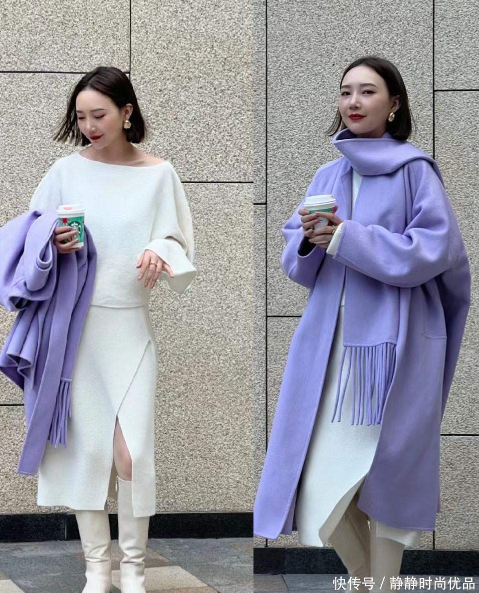 一般来说,紫色的饱和度偏低,营造出的风格就会更为温柔减龄,像上图这件浅紫色的大衣,在春季就可以担当起保暖与烘托气质的双重作用。