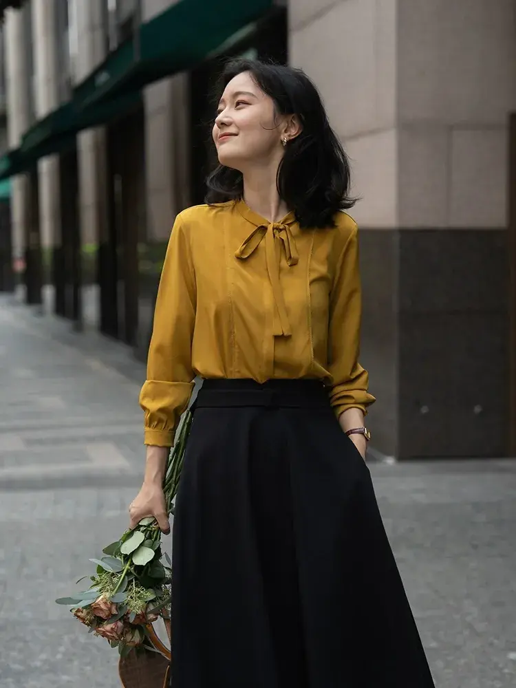 由这件姜黄色的系带衬衫结合小小的系带设计,代替了传统的立领剪裁设计,反而更增添了几分柔美优雅,系带不算夸张,小小的蝴蝶结彰显满满的温柔感和灵动感。