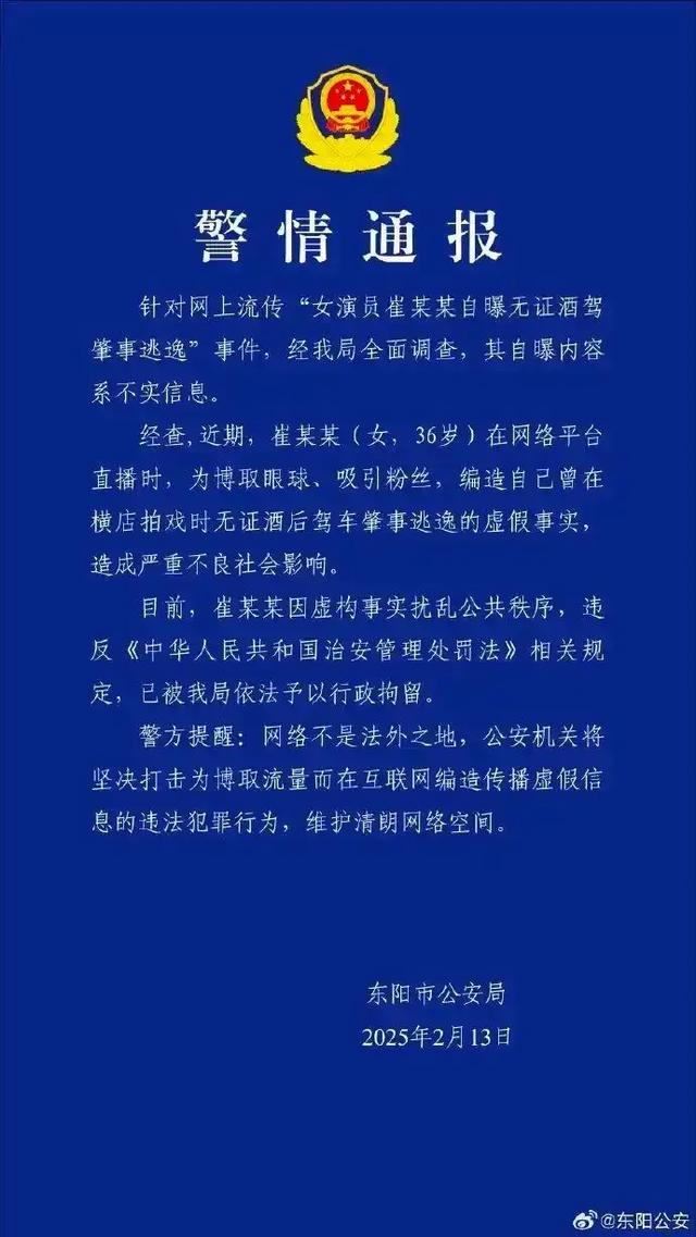 2月13日,东阳市公安局通报称:经查,近期崔某某(女,36岁)在网络平台直播时,为博取眼球、吸引粉丝,编造自己曾在横店拍戏时无证酒后驾车肇事逃逸的虚假事实,造成严重不良社会影响。目前,崔某某因虚构事实扰乱公共秩序,违反《中华人民共和国治安管理处罚法》相关规定,已被我局依法予以行政拘留。