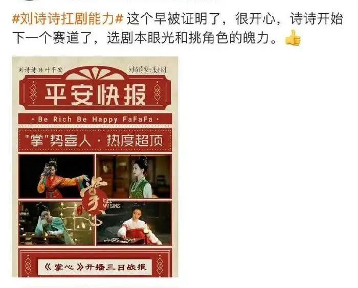 刘诗诗主演的新剧《掌心》播之前不少人都夸造型好看(刘诗诗古装造型是一直都不错),但播出后数据却并不是特别好,甚至有不少网友都吐槽她扛不起剧,今年的新剧彻底扑街了。紧接着,新剧制片人就在网上发文力挺刘诗诗,为她正名扛剧能力,夸她选剧本、挑角色很有眼光和魄力。