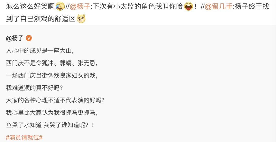 杨子参加的演技综艺刚上,留几手就开启线上吐槽模式,吐槽杨子不要脸的同时还爆出他录制芒果离婚综艺时逃跑失败,转头又去跟女明星演泡澡戏,不要脸!等后续又吐槽杨子找到自己演戏的舒适区,被杨子反怼“下次有小太监的角色我叫你哈”。后台有瓜友好奇,他俩这么闹是做戏,还是表面互相调侃其实里面也真暗藏小心思?