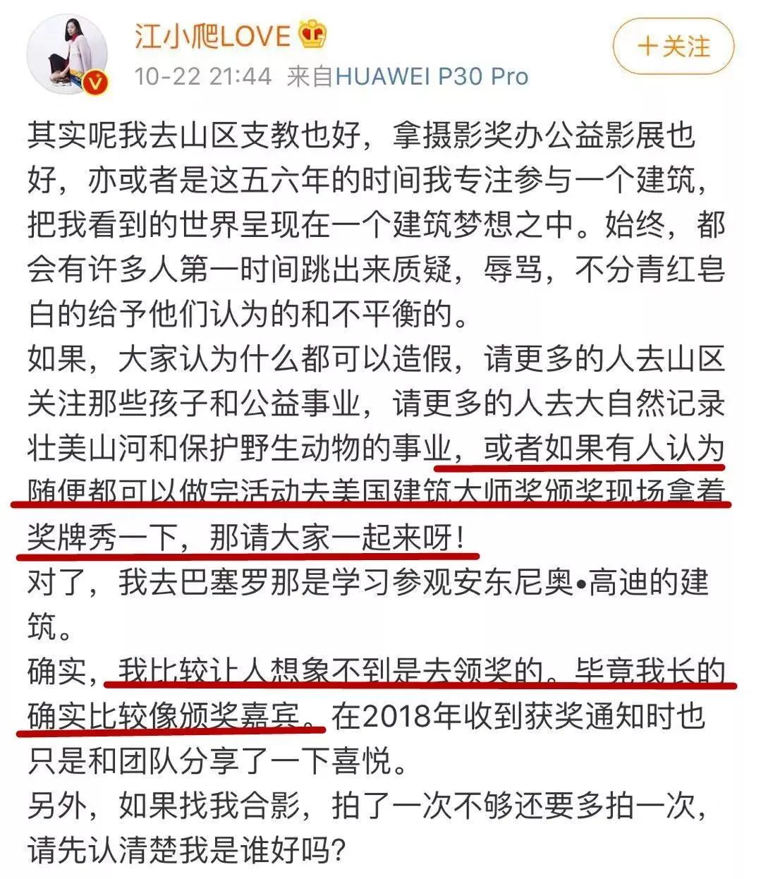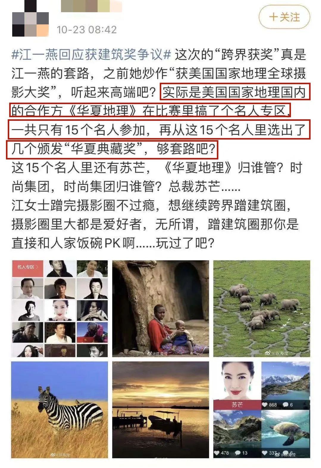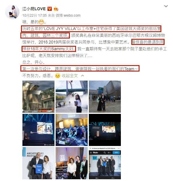 但如今,这个项目获奖了,她却以设计师的名义前去领奖,抢去了设计师的功劳,并在社交平台大肆宣传,营造出一种“建筑才女”的错觉。