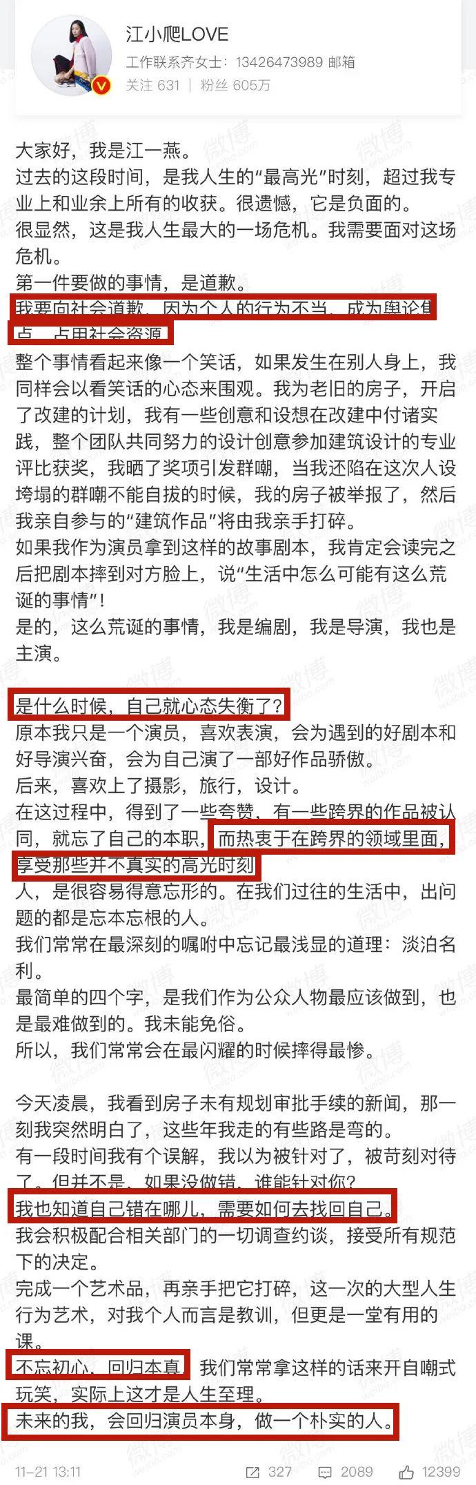 她发长文进行了道歉,直言“这只是她自导自演的一场戏”“为了满足自己的虚荣心”等,并在长文最后表示,自己会“回归演员本身,做一个朴实的人”。