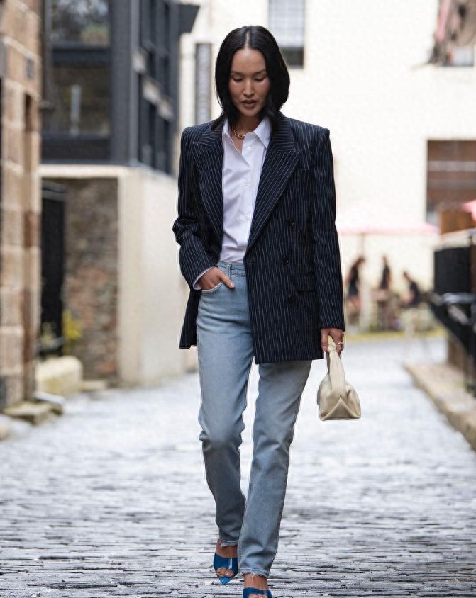 Nicole Warne 身穿AGOLDE# Lyle 牛仔裤,以浅色丹宁中和硬朗造型,演绎摩登飒爽气派。