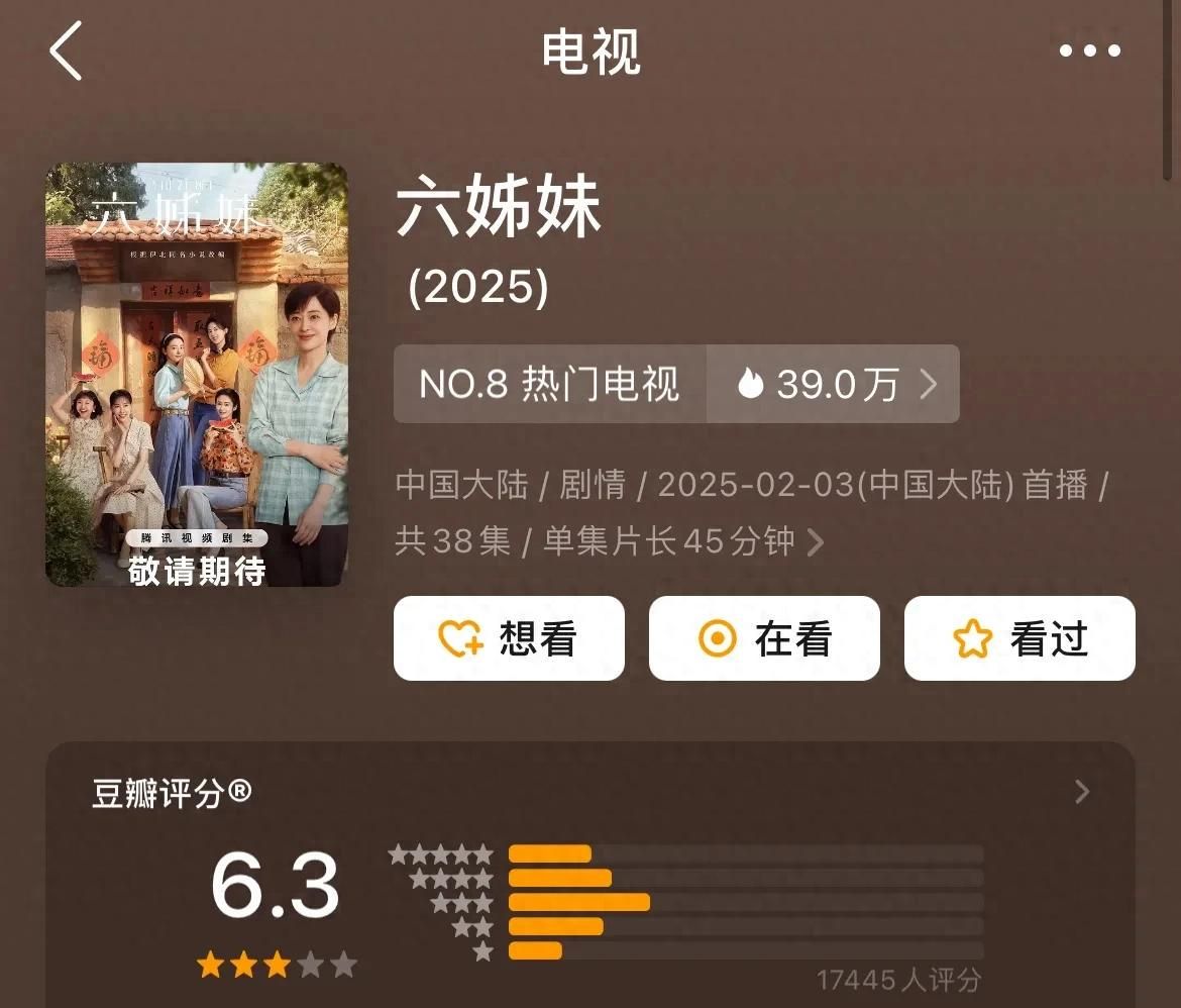 反观口碑爆棚的《人世间》、《〉就像是说书人讲故事,娓娓道来,不刻意制造矛盾。话说你看了《六姊妹》了吗?豆瓣6.3分高了还是低了,欢迎评论区留言私信。