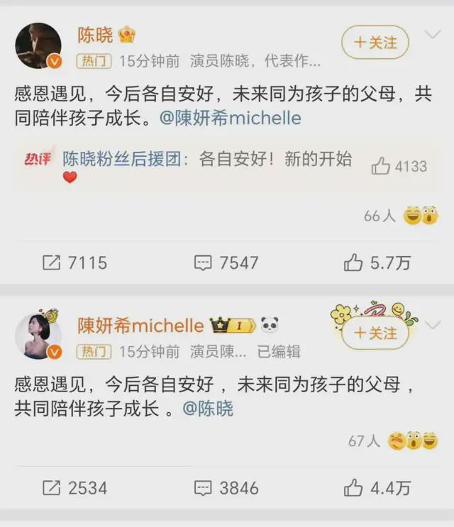 陈晓、陈妍希真的离婚了,官宣文案里两个人的措辞都很冷静体面,「感恩遇见,今后各自安好,未来同为孩子的父母,共同陪伴孩子成长。