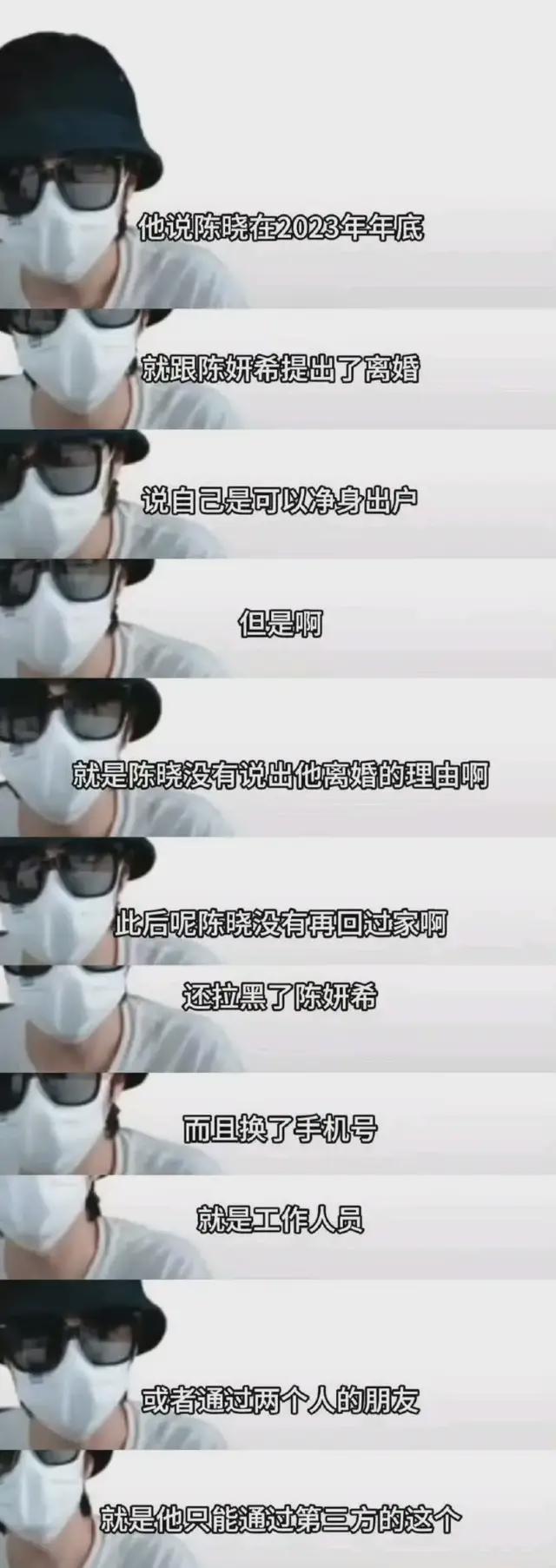 当时狗仔就爆料说陈晓提出了离婚,为了离婚可以净身出户,为此他没再回家,还换了电话拉黑陈妍希,有什么事就靠工作人员或者两人共同的朋友斡旋。