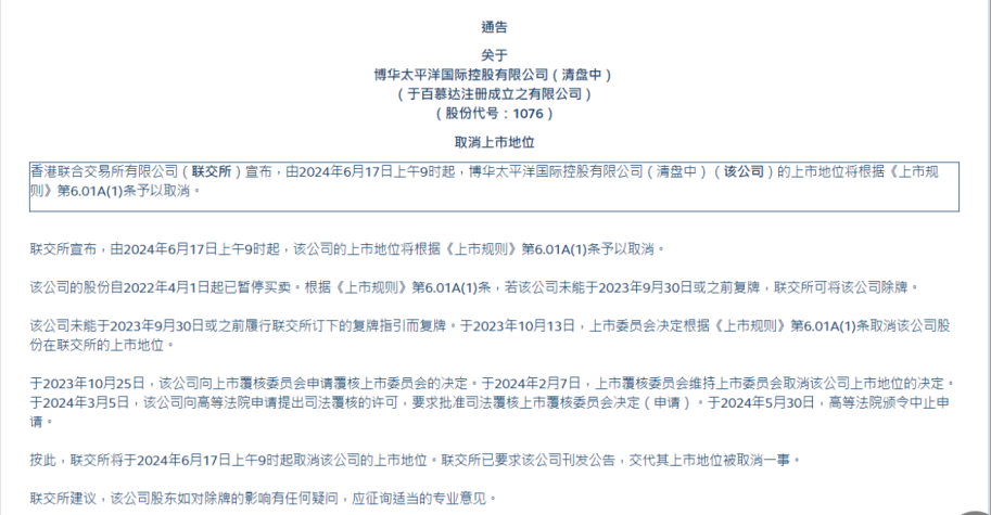 截至2023年10月,已跌至仅剩0.01港元,沦为“仙股”,面临退市危机。2024年6月17日,港交所发布公告,博华太平洋上市地位被取消。