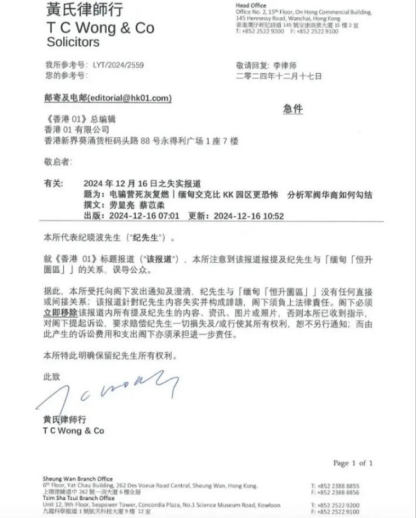不久前,一张缅甸电诈园区的关系图在网络上疯传,幕后三个大老板也被曝光,其中就包括纪晓波。这张关系图引发了网友们的谩骂,吴佩慈迅速出来辟谣,“霸气护夫”。在社交平台晒出一张提告香港媒体的律师函。