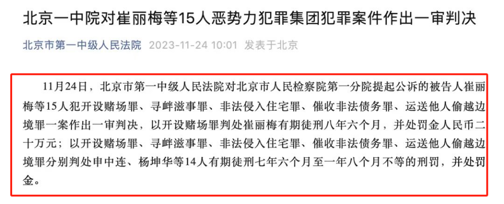2023年11月,北京市第一中级人民法院通报,纪晓波主导的恶势力犯罪集团被捣毁,其姨妈崔丽梅作为团伙主要成员被判处有期徒刑8年6个月,并处罚金人民币20万元。但纪晓波并没有一并伏法。