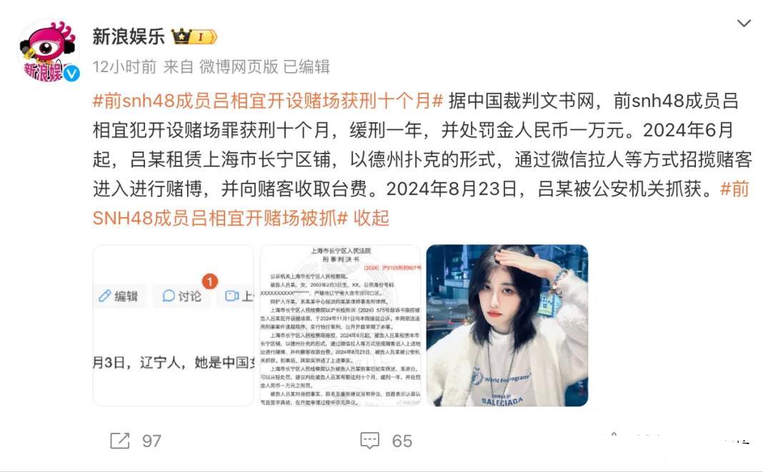 如今她已经被抓,因开设赌场罪获刑十个月,缓刑一年,并处罚金人民币一万元。