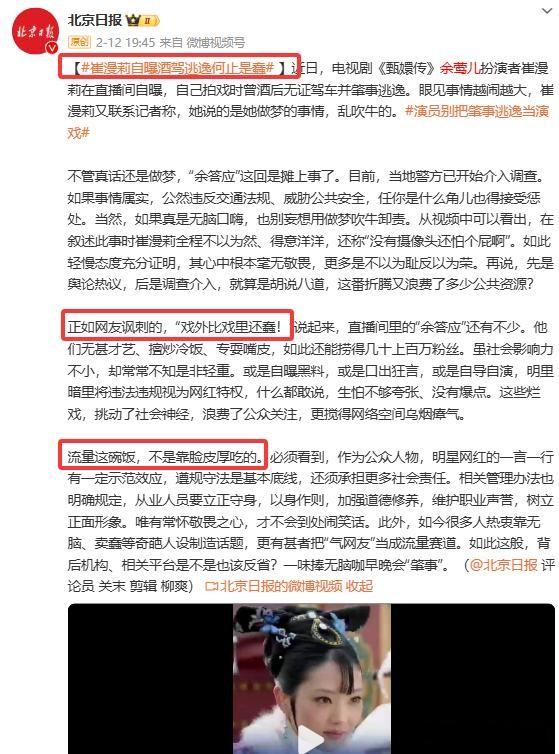 根据通报可知崔漫莉为博取眼球,吸引粉丝,编造了自己在横店拍戏时无证酒后驾车肇事逃逸的虚假事实。