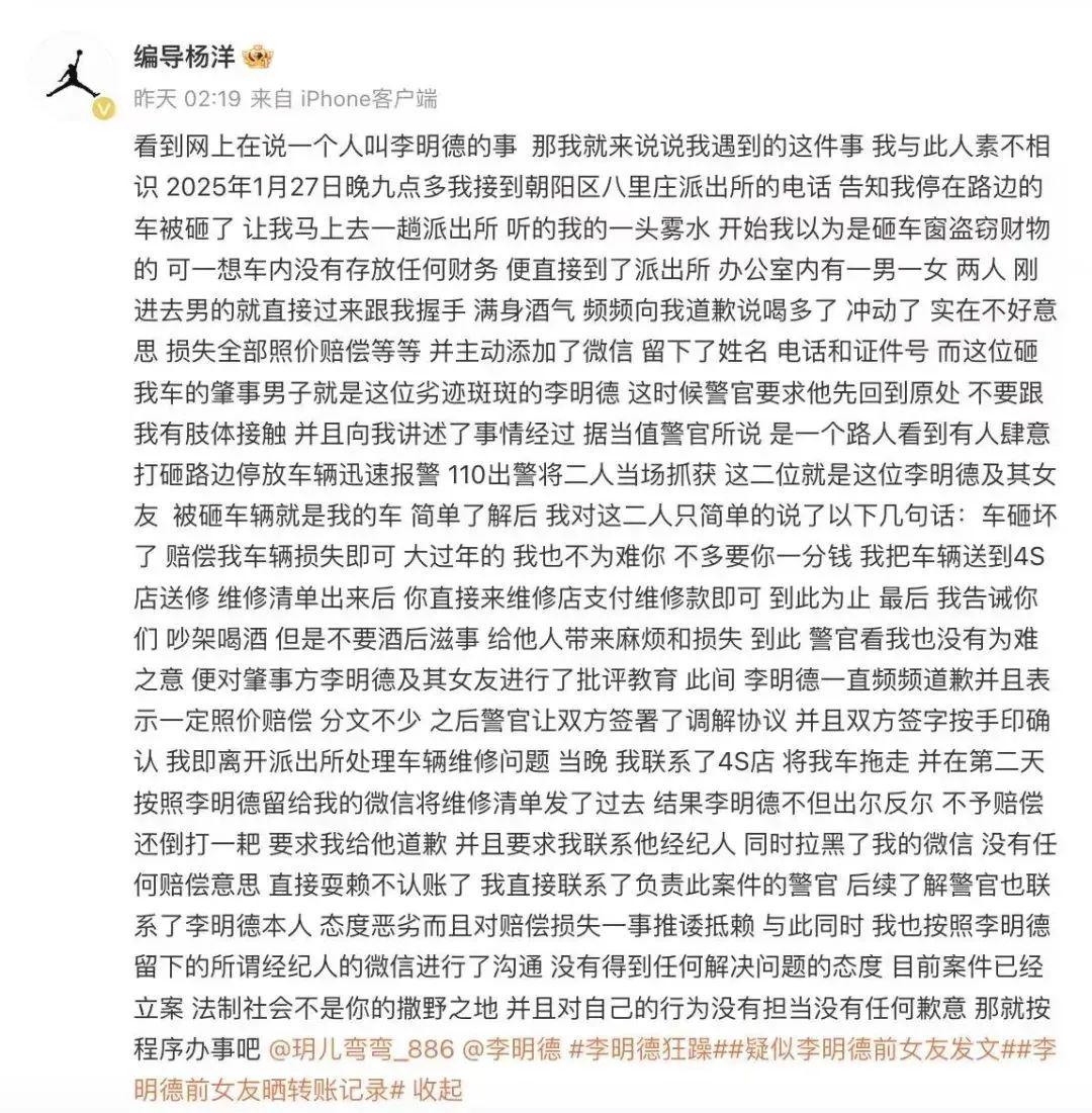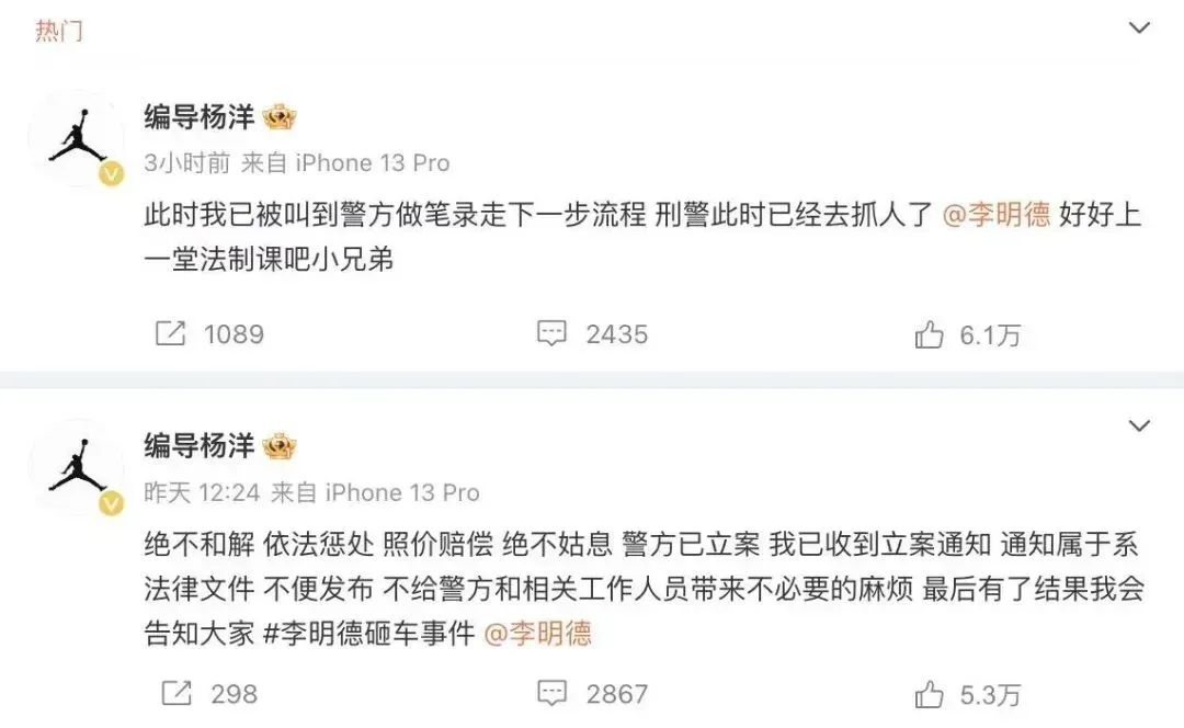 最终,2月13日,北京警方通报,李明德存在砸车毁财违法犯罪行为,已经被刑事拘留。