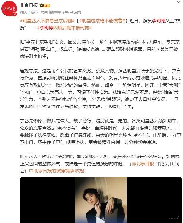 对于李明德被抓一事,《北京日报》发表评论文章称“只要触碰了法律底线,践踏了道德红线,再大的明星光环也‘罩不住’”。直言“明星艺人不该总当法制咖”。