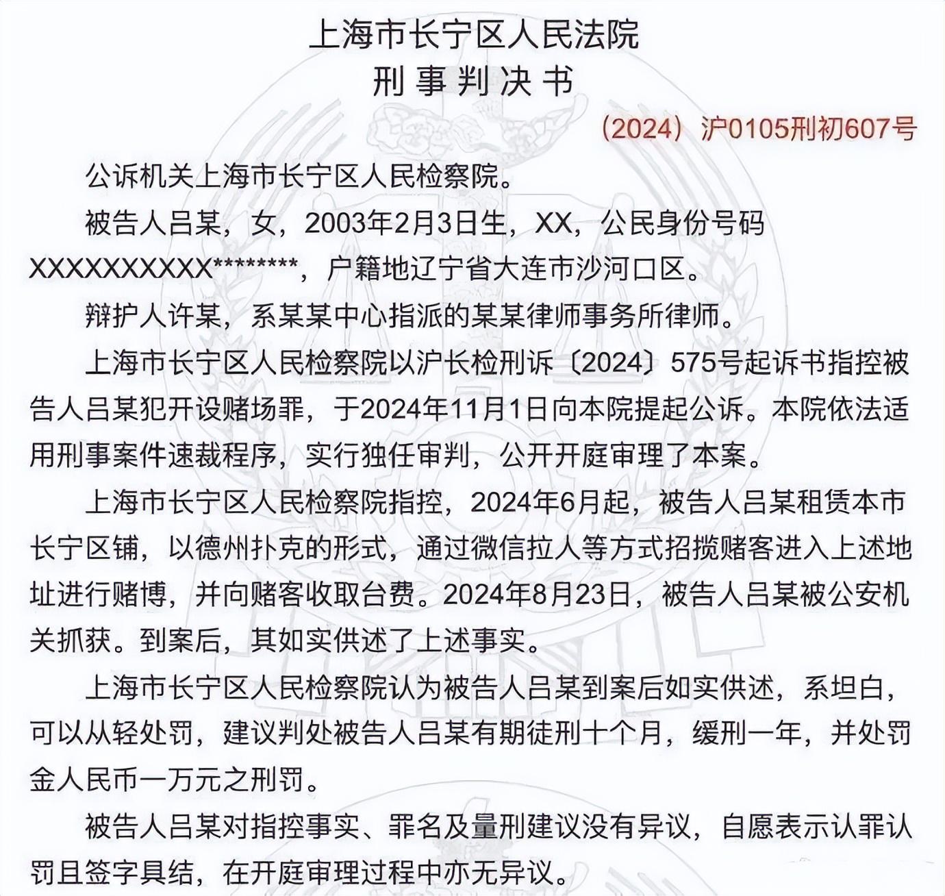 根据中国裁判文书网上的刑事判决书可知,从2024年6月起,吕相宜就在上海开设地下赌场。