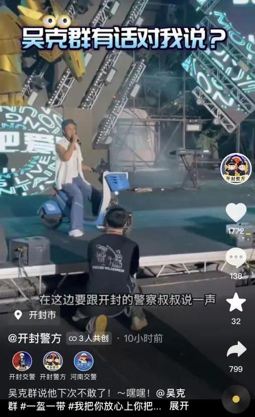 吴克群在现场道歉并喊话开封警方:“我想对开封的警察叔叔说一声,不好意思,没戴头盔,我下次不敢了!”并呼吁大家骑行电动车一定要佩戴头盔。