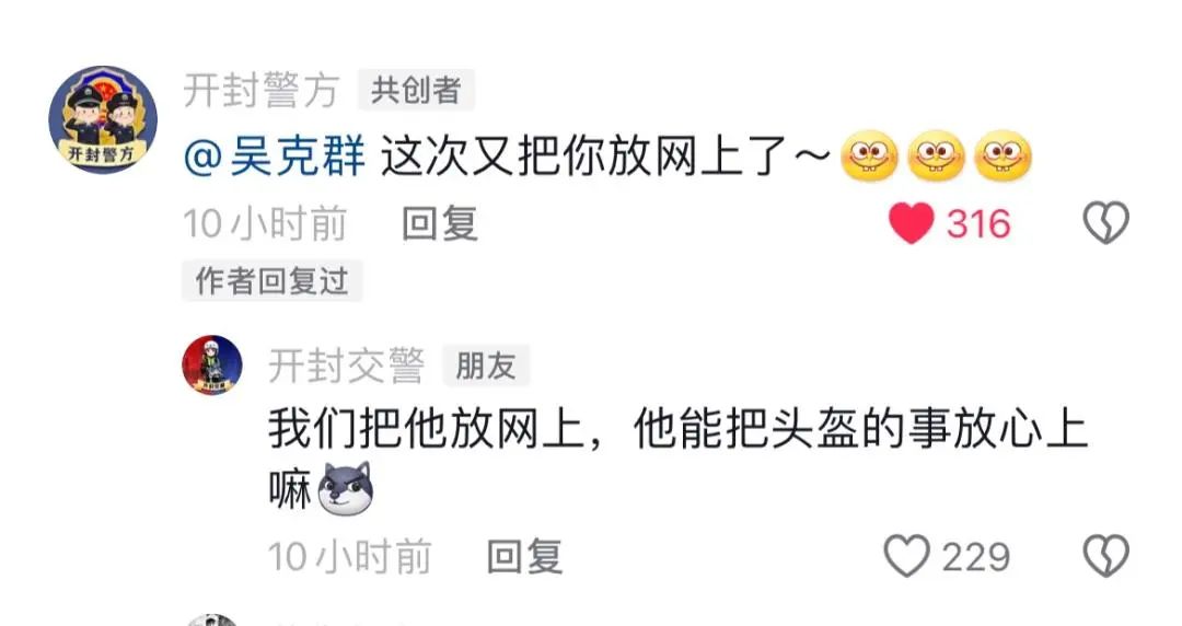 开封警方接受道歉并趁机宣传一波:一定要把戴头盔放心上。