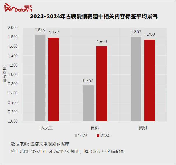 在包含“大女主”“复仇”“爽剧”三个内容标签中,独特性较弱的是“大女主”“爽剧”,该内容标签在2024年的播出景气指数反馈已出现下降,因此亟需提升大女主和爽感以外的内容独特性。