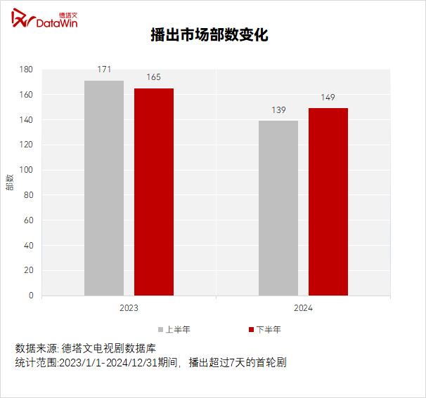 2024/2023年播出数量同比:上半年播出量同比缩水18.7%,下半年同比缩水9.7%。下半年播出积极性回暖,下降势头扭转。