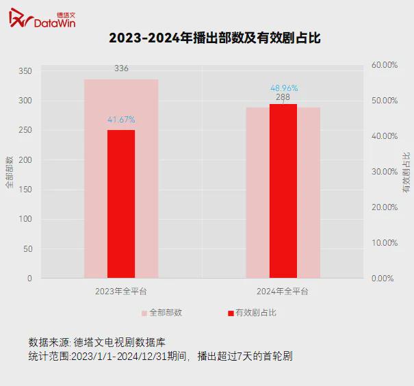 有效播剧率:根据德塔文景气指数数据建模概念,年度景气指数(包含播出期及长尾期加权)达到1以上的剧,至少实现了对部分观众的有效覆盖,具有一定社会效益,可算作做有效播剧。