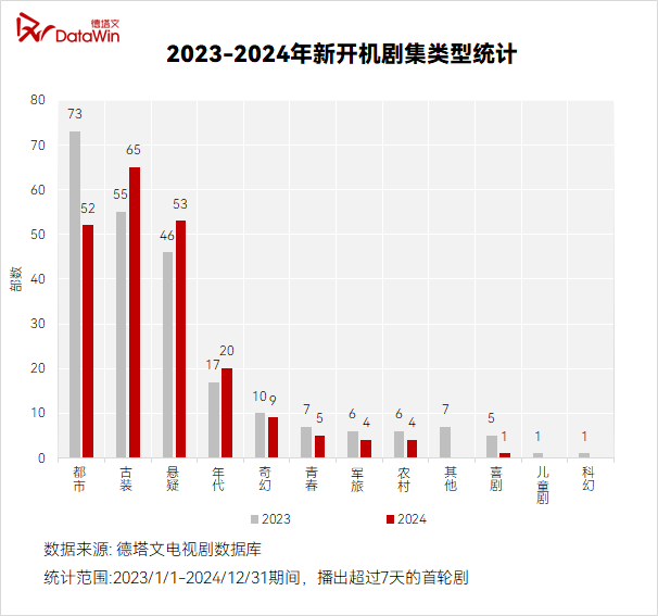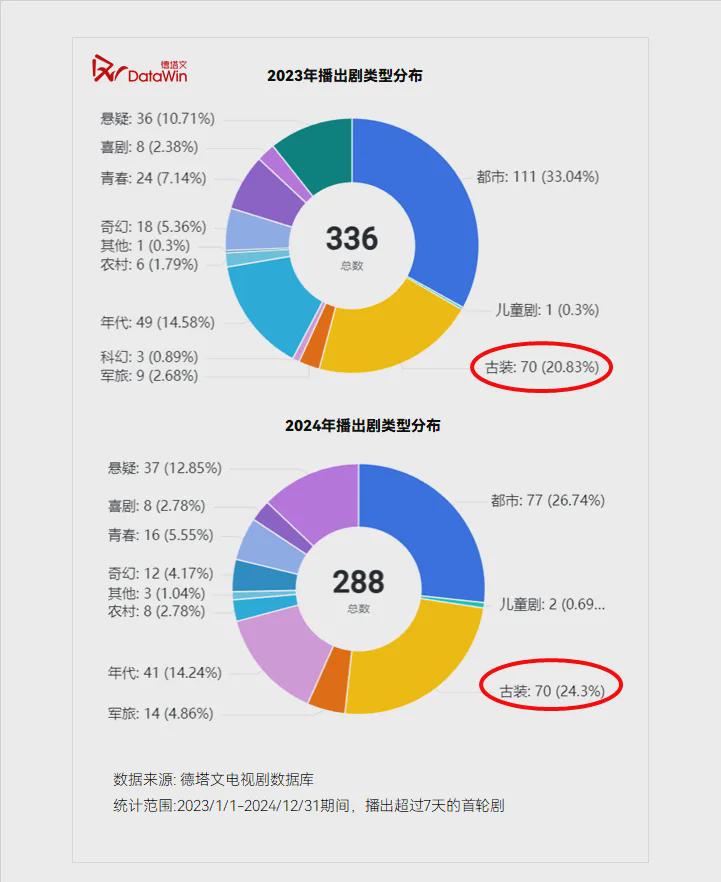 古装剧保持稳健。两年播出数量完全持平,作为当下娱乐社交货币,仍是最常青类型市场,即使古偶被舆论鄙夷。当前创作范围正在拓展,敷衍的内容不再有生存空间;