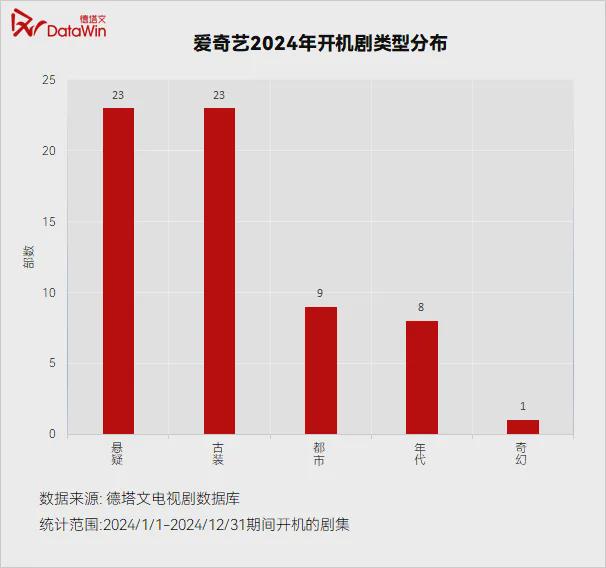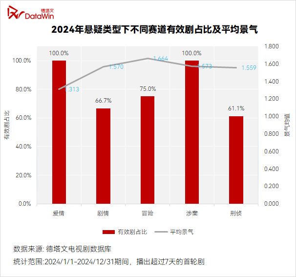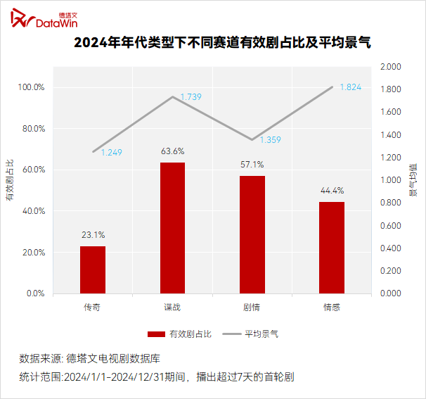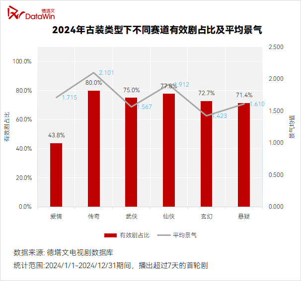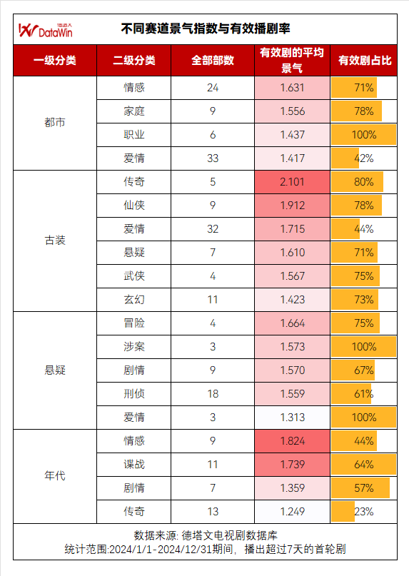 2024年整体市场中,实现有效播剧率和景气指数双赢的赛道有:古装传奇剧、古装仙侠剧、悬疑冒险剧、悬疑涉案剧。