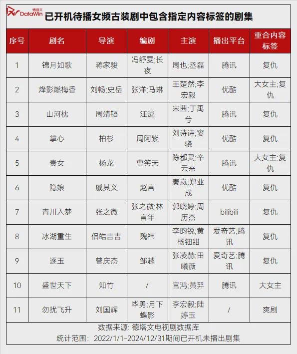 已开机待播古装剧中包含“复仇”“大女主”“爽剧”内容标签的剧集