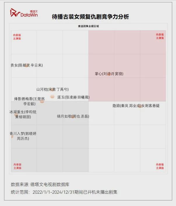 已开机古装剧中,包含“大女主”“复仇”内容标签的剧集中,《掌心》《贵女》《山河枕》综合竞争力较高。
