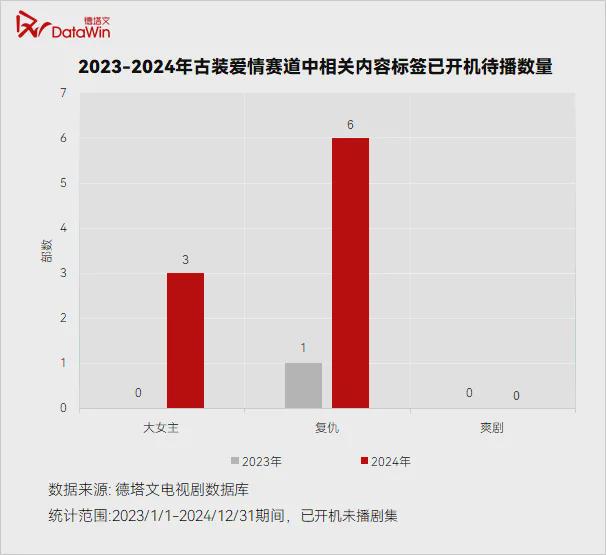 2023-2024年已开机待播的古装爱情剧中,有10部剧集选择了“大女主”“复仇”相关内容。此外,部分尚在开发中、未官宣的作品,也让相关剧集数量有进一步提升的可能,已是较拥挤赛道。
