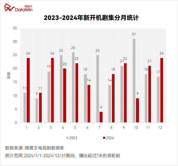 2024年长剧开机数量为213部,较2023年下降了9.0%。开机数量的减少,也必然导致来年播出数量的缩减。开机数量的减少在下半年更为明显,但除奥运、国庆的个别月份外,也并未出现总量的断崖式下跌,主因还是各平台调整策略更为谨慎所致。