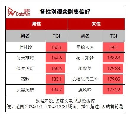 2024年的观众偏好度证明,女性观众需要更多爱情以外的内容,女性观众偏好度更高的剧集都包含了女性成长、传奇、奋斗的角度。男性观众则仍最为偏爱军旅、刑侦、反黑等硬核题材作品。