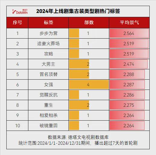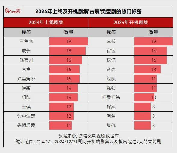 “成长”“官宦”“组队”“逆袭”等内容标签在2024年已有多部爆剧、热播剧认证,不仅在当前市场热度不低,在未来市场的热度也较为稳定,即使是古装剧,也流行关注“中产打工人”“团队感”“自我效能感”。古装本质还是对当代社会心理的满足和投射。
