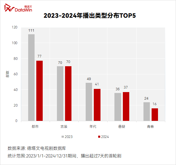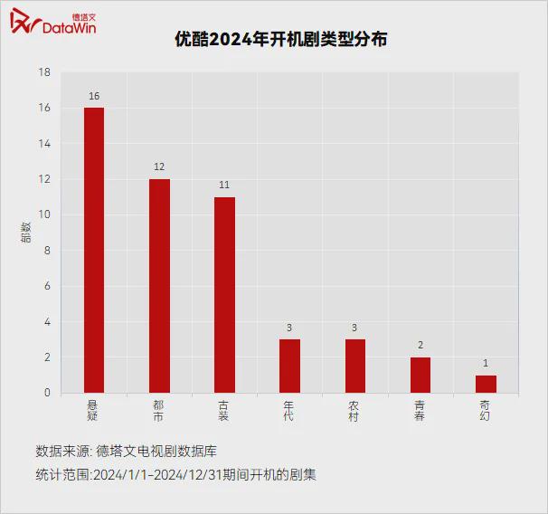 悬疑剧逆势增长。四大主流类型市场中,唯一播出量逆势增长,主因或是悬疑剧始终是最注重“卷内容”的市场。2024年内容元素更加丰富,凭借无限流、伪纪录片等多形式创新产出了诸多热门作品,生命力仍然顽强。