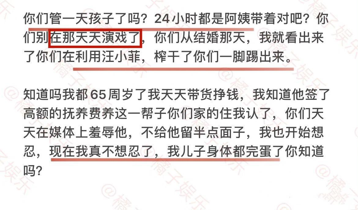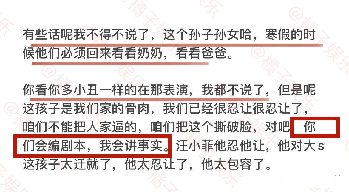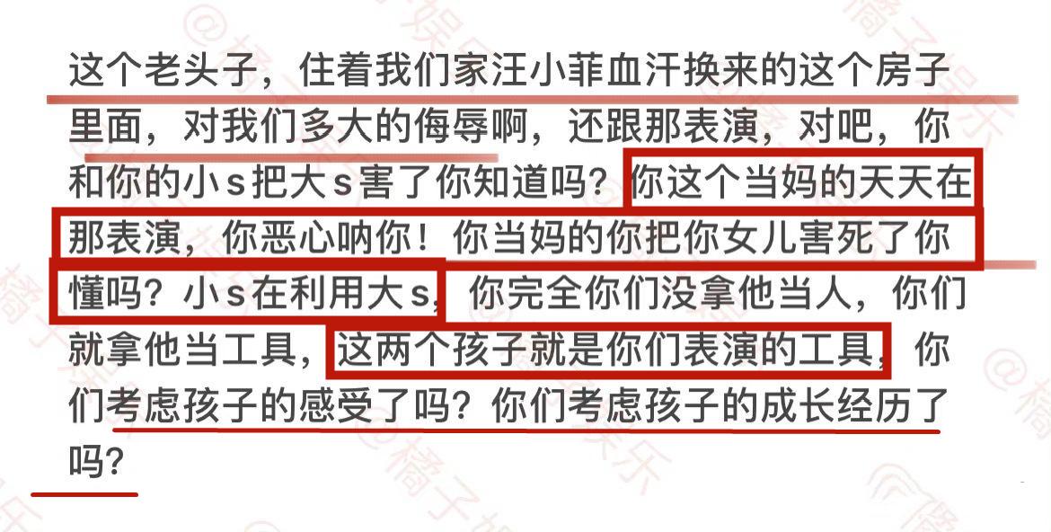 她还说S妈天天表演,会将女儿害死。还说小S在利用大S,大S的2个孩子是S家表演的工具。