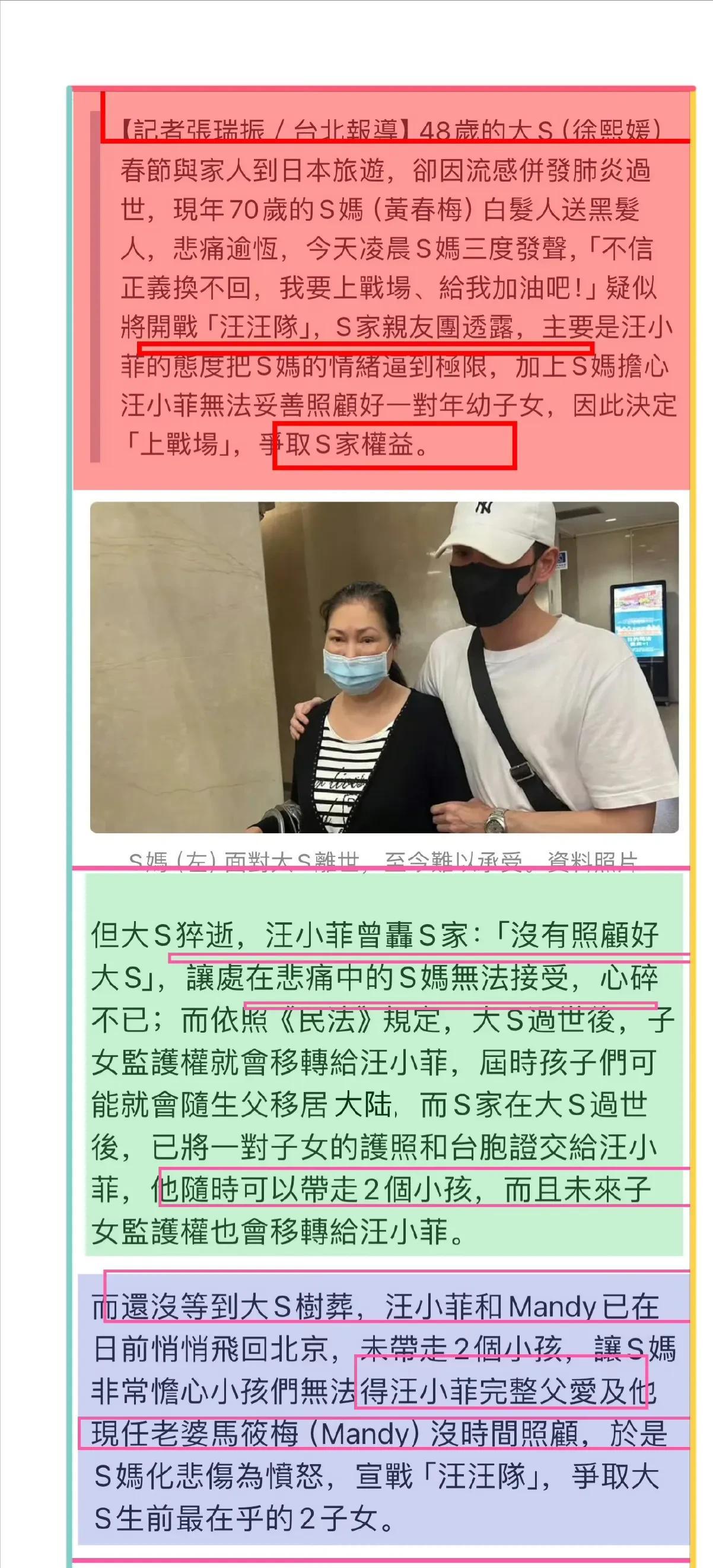 当时台媒曝出S妈宣战的原因是担心大S的2个孩子得不到汪小菲完整的父爱,担心马筱梅没时间照顾他们。