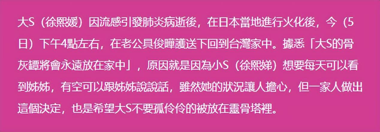 2月5日,小S出钱将大S的骨灰包机回台。当时台媒报道称,大S的骨灰将永久放在家中。