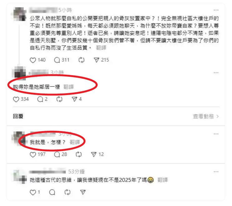 邻居喊话小S,质问她为什么不将大S的骨灰放在自己家中。邻居怒斥S家完全忽视整个大楼业主的不安,损害了其他业主的生活品质。
