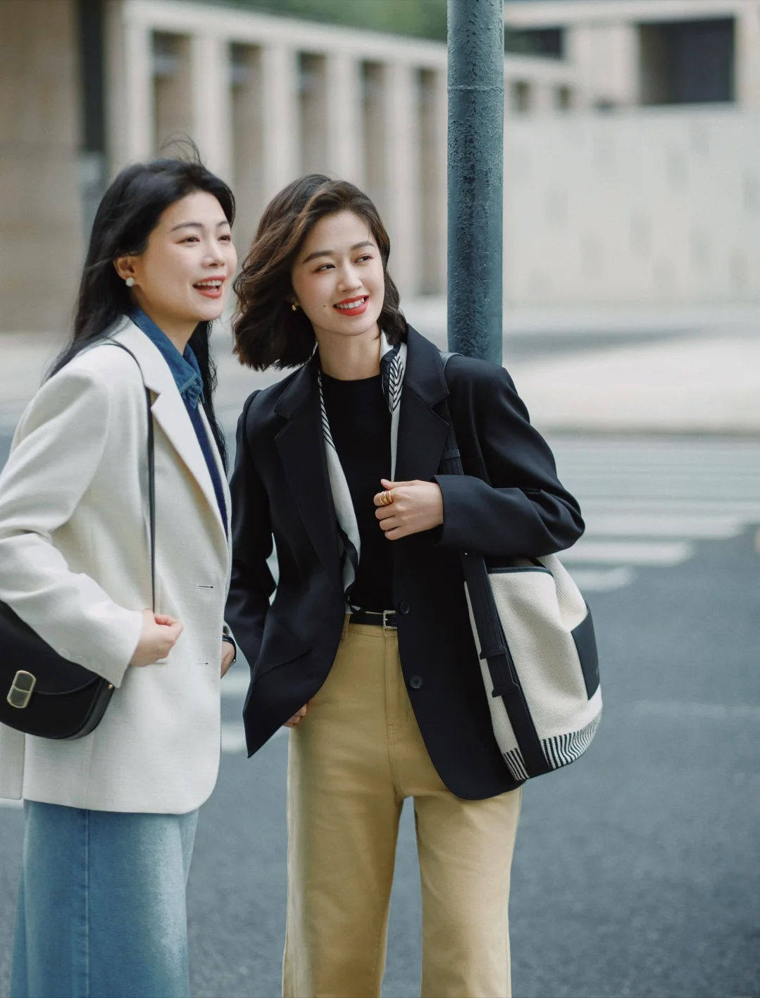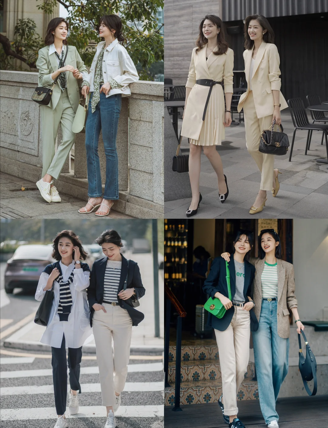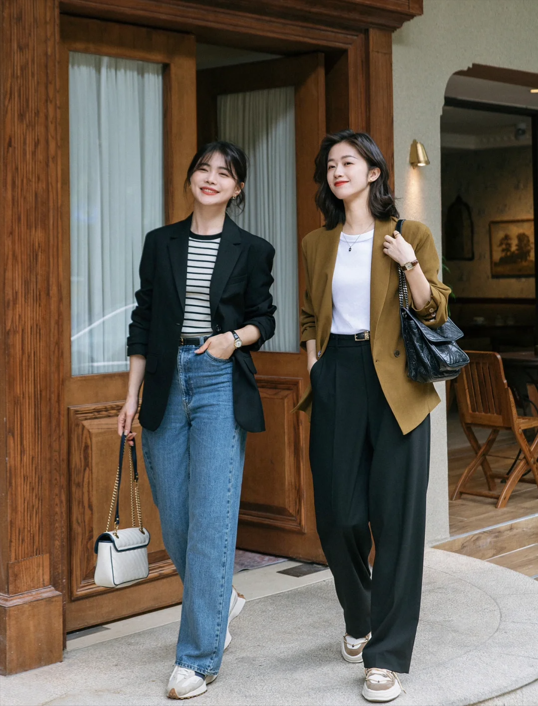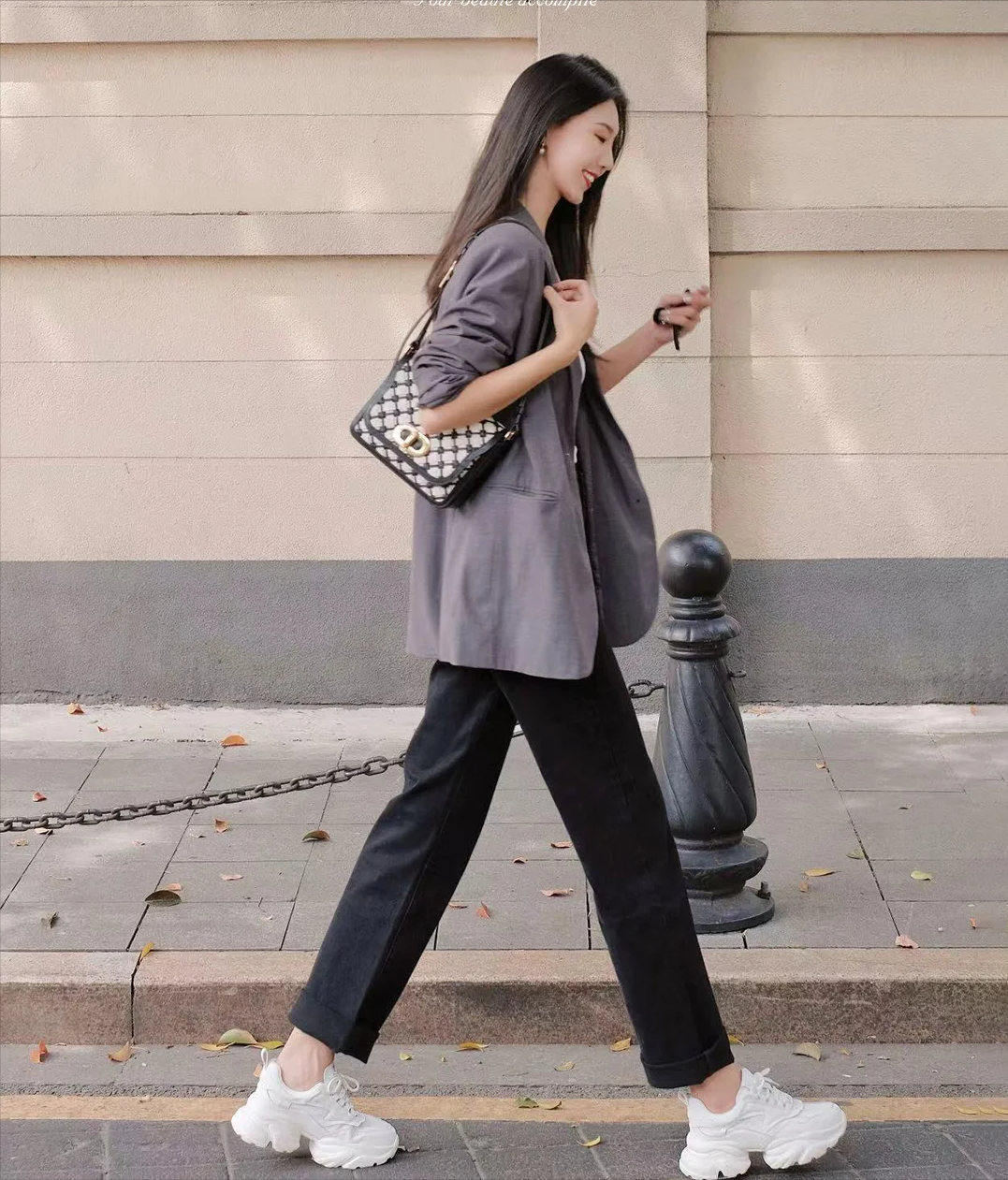 我们来谈谈如何将“西装+运动鞋”的组合做得洋气又好看。首先,要注意西装的选择。可以选择一套修身剪裁的西装外套搭配宽松的西装裤,这样能够平衡整体的比例,既能突出女性的曲线美,又能显露西装的干练风格。
