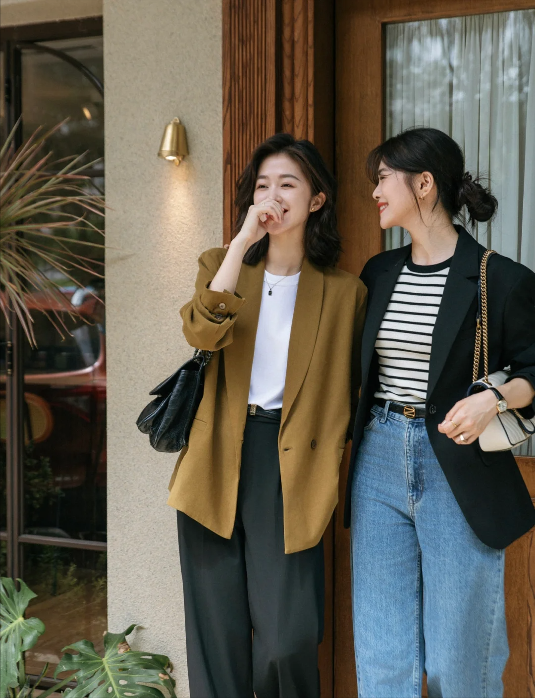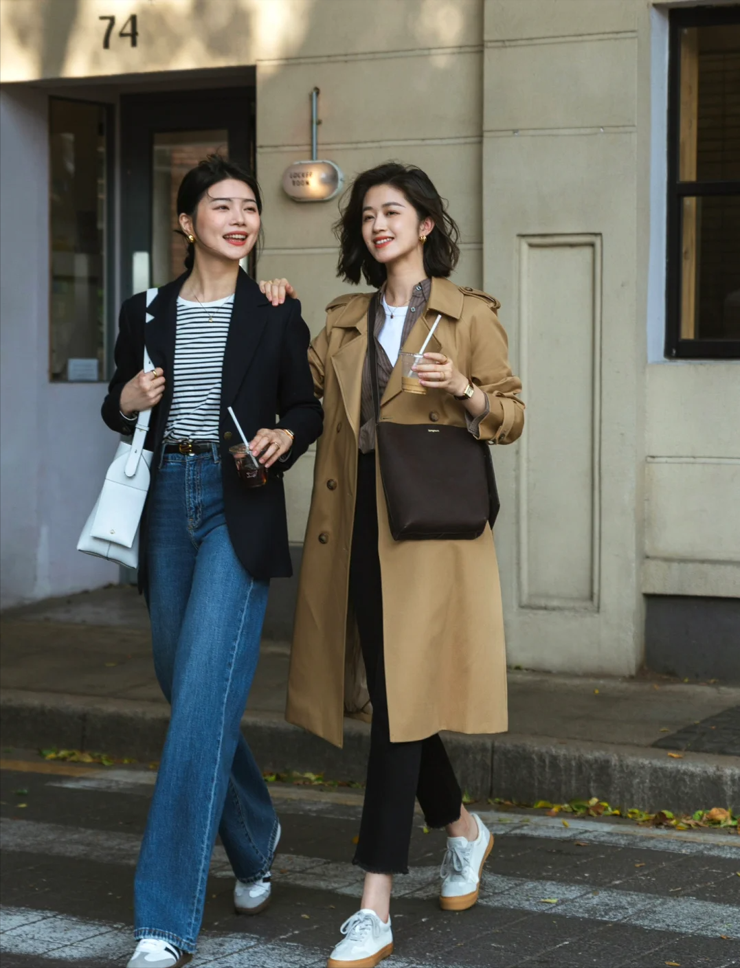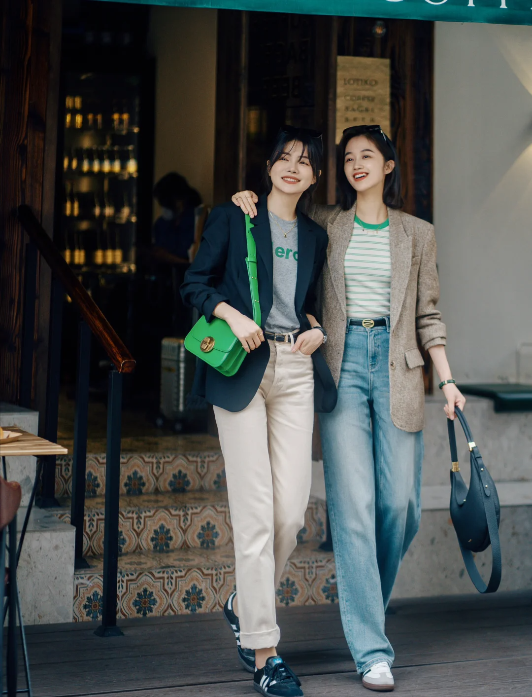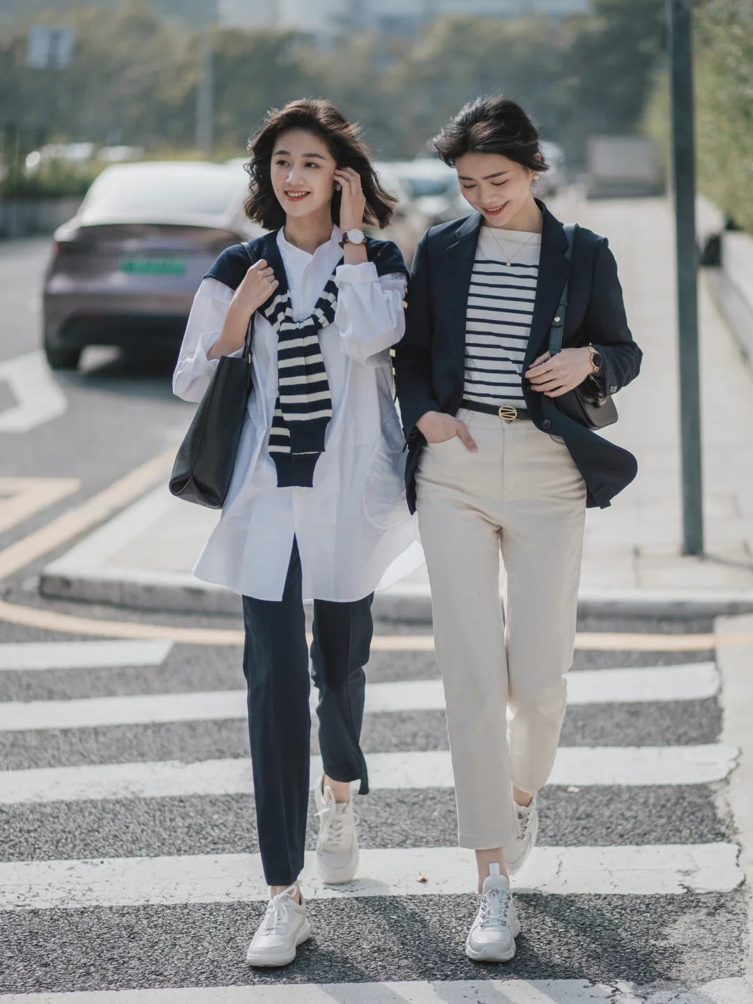 我们来谈谈如何将“西装+运动鞋”的组合做得洋气又好看。首先,要注意西装的选择。可以选择一套修身剪裁的西装外套搭配宽松的西装裤,这样能够平衡整体的比例,既能突出女性的曲线美,又能显露西装的干练风格。