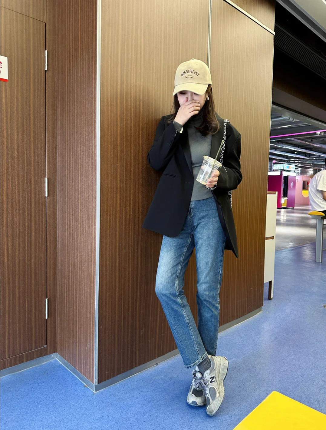 可以用牛仔裤和运动鞋搭配,就算是穿搭一件黑色的西服外套,都不会显得正式感,穿搭出门逛街都很fashion~