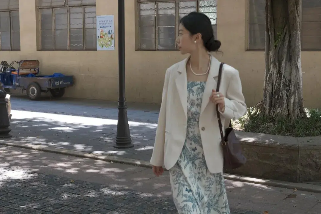 米白色西装知性干练,稳重大气,搭配上一条V领的碎花连衣裙,短裙剪裁设计,更多了几分温柔俏皮,和干练的西装组合在一起,色彩清爽,风格对碰,显得格外的温柔大气。