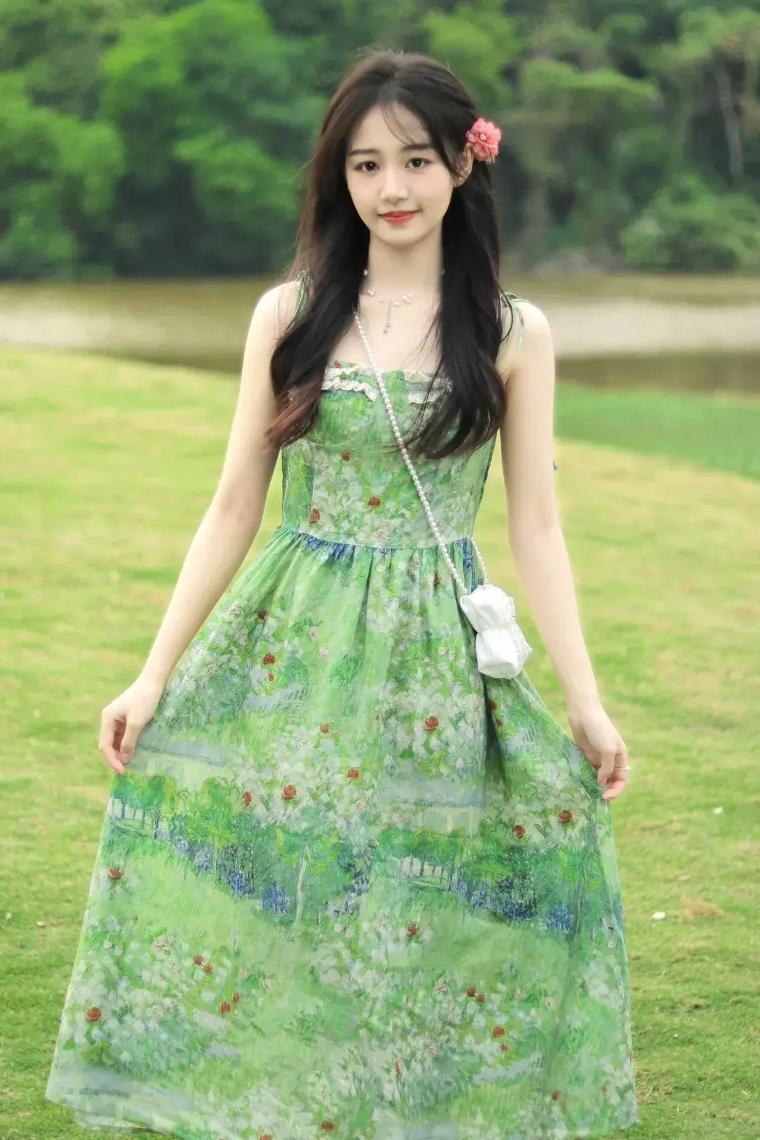 半透视的白色衬衫外套,使得肌肤线条若隐若现,更多了几分神秘朦胧的气质,里面的这条碎花吊带连衣裙采用的是绿白的配色,清爽干净,给人沁人心脾的既视感,并且采用了这种上紧下松的建材设计,勾勒出完美的身材线条,整体气质上更显优雅灵动了。