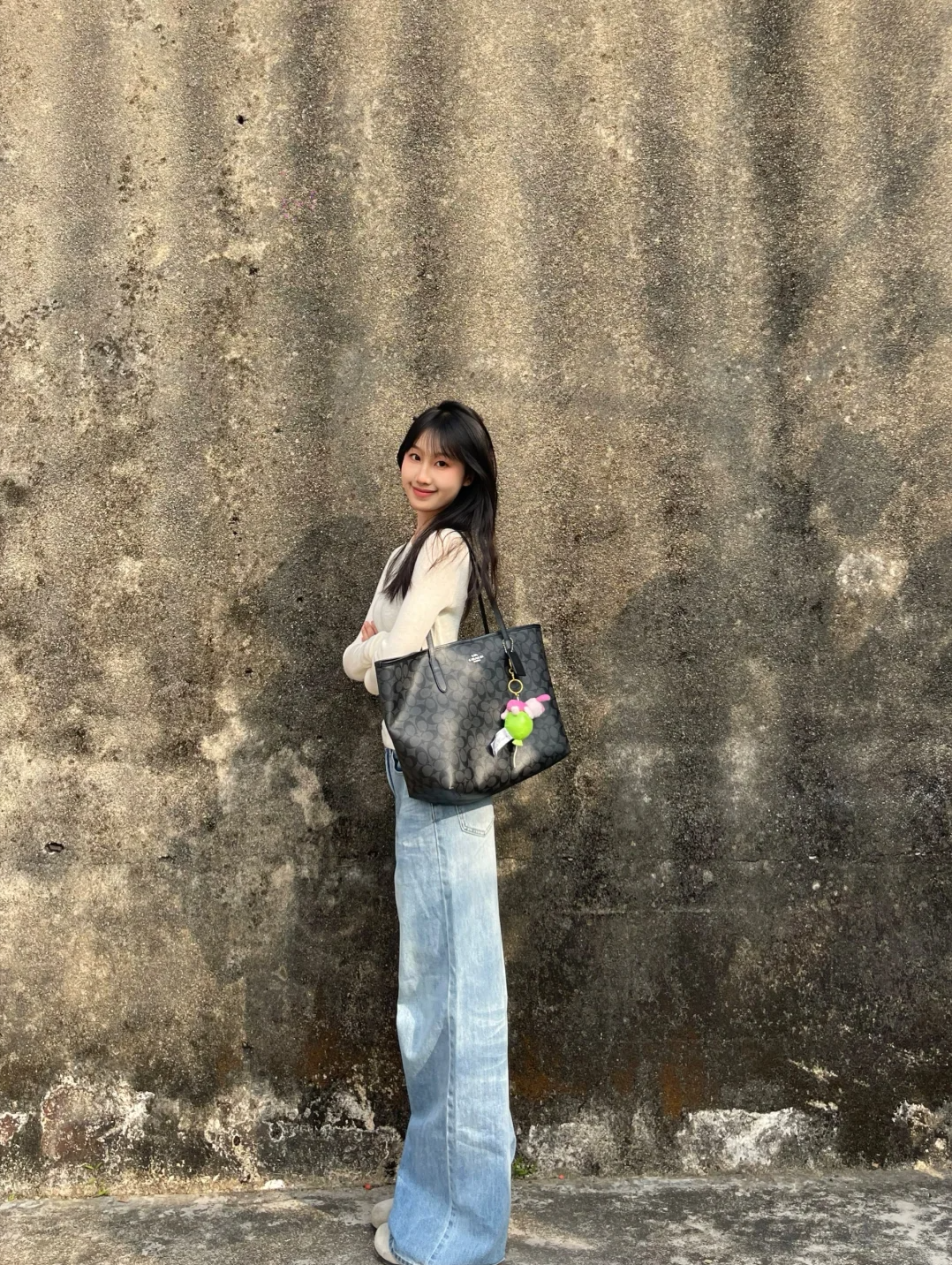 特别是梨形身材的女生,很适合这样的牛仔阔腿裤,可以很好的把假胯宽给藏起来,上面再搭配一件黑色的针织衫就够了,就能达到上紧下松的穿搭方法,呈现出你凹凸有致的身材线条感更加迷人。