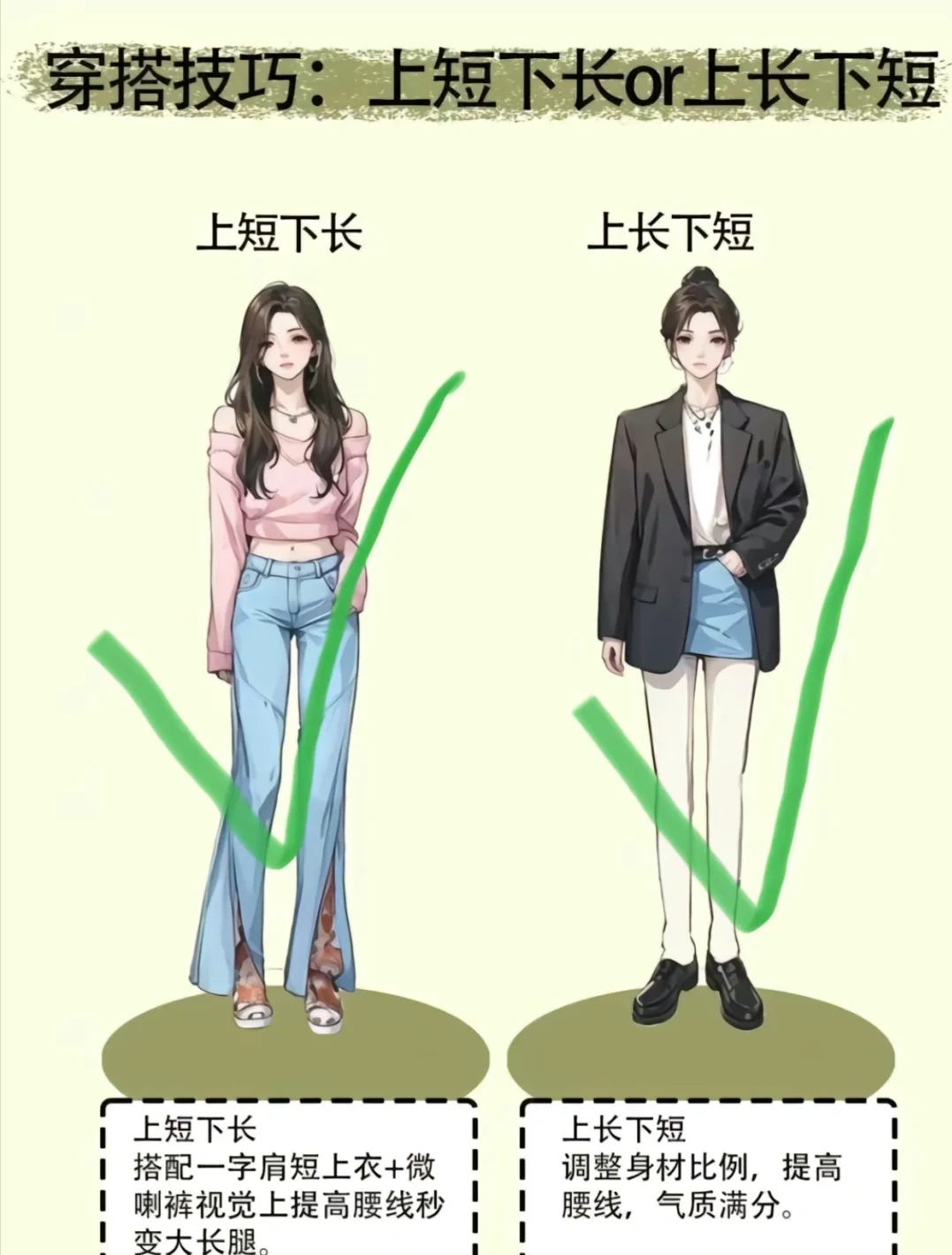 为了避免上下身之间的视觉断裂感,可以选择高腰的下装来提升腰线,进一步拉长腿部线条。
